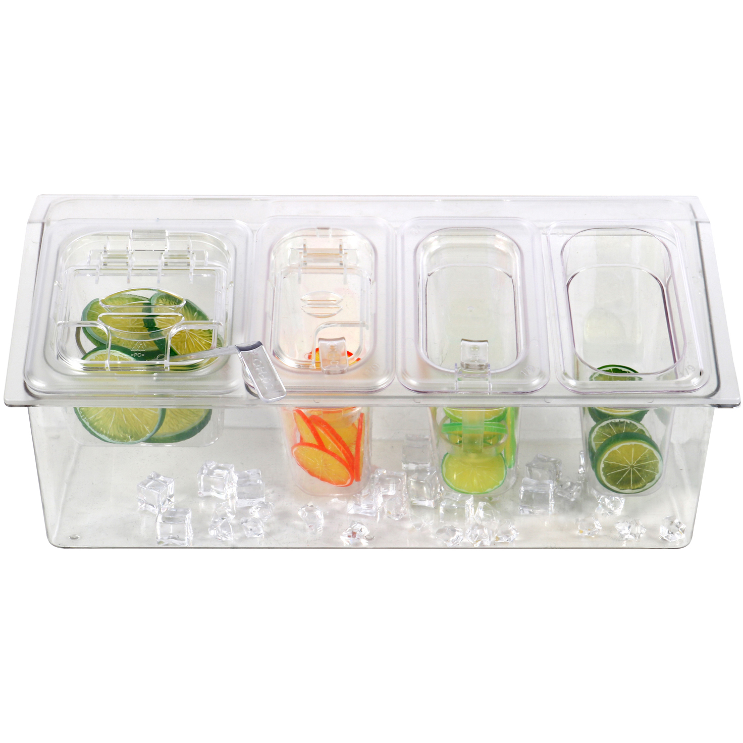 Izmantojiet šo garšvielu turētāju ar ieliktņiem, lai saglabātu jūsu bāru vai restorānu ar svaigām garšvielām. Svaigas garšvielas un dekorācijas patiešām piešķir jebkuram dzērienam vai ēdienam pabeigšanas akcentu! Šis garšvielu turētājs ir ideāli piemērots lietošanai bārā, bet to var izmantot arī, lai turētu pārtiku jūsu virtuves sagatavošanas zonā, bufetē vai ēdnīcā, lai nodrošinātu vieglu pašapkalpošanās iespēju. Vāks palīdz novērst krustenisko kontamināciju un aizsargā pārtiku no gaisa piesārņotājiem. Jūsu pārtikas produkti ilgs ilgāk, ja piepildīsiet šī garšvielu turētāja pamatni ar ledu. Tas uzturēs jūsu aukstos produktus svaigus un gatavus lietošanai ilgāku laiku. Pateicoties spēcīgajai plastmasas konstrukcijai, konteiners ir pietiekami izturīgs, lai izturētu biežu lietošanu. Plastmasa ir viegli noslaukāma dienas beigās, nodrošinot tīrību un higiēnu jūsu iestādē. Ir noliktavā