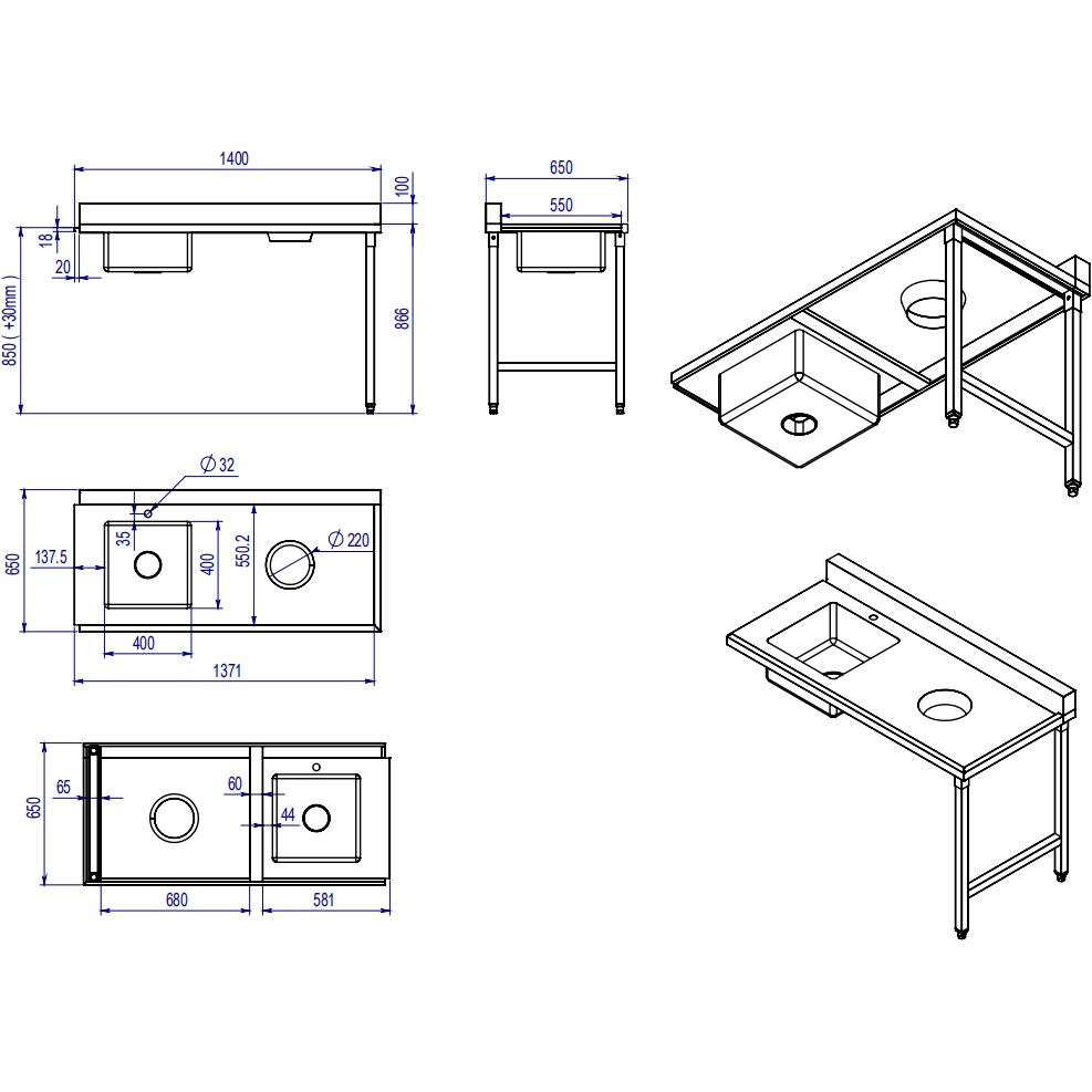 Iekraušanas galds labajā pusē 1400x650x850mm Ar izlietni Ar notekas caurumu Ar aizsargmalu Nerūsējošais tērauds | Adexa DWITC1465R