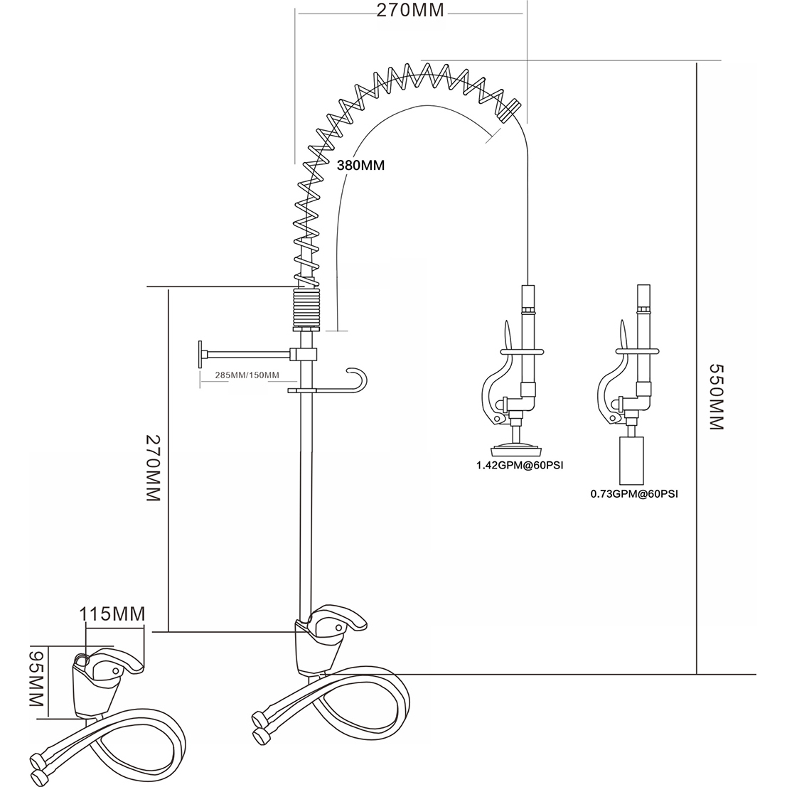 Pastiprinājums: 270 mm / Šļūtene: 380 mm / Atsperes: 270 mm